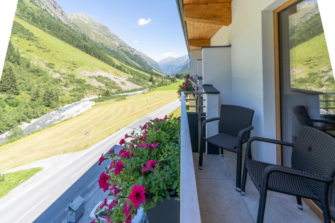 Suite with Balcony and View. - balcony with views of the Pitztal Mountains - infrared cabin for up to 4 persons - private bathroom with a separate toilet - separate bedroom - living room with a sofa and a box spring bed - fireplace - 2 flat-screen TVs Please note that the room rate is based on 2 guests. Maximum occupancy is 4 guests (see Extra Bed Rates). Modern, romantic, and spacious 52 m² suite with wooden floors and balcony. ;